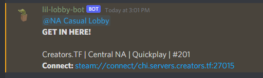 It will send a discord ping to a specific role. The goal is to only send pings that people actively want by having them join the lobby specifically to be alerted. Made for TF2 but should work with anything compatible with python-a2s.