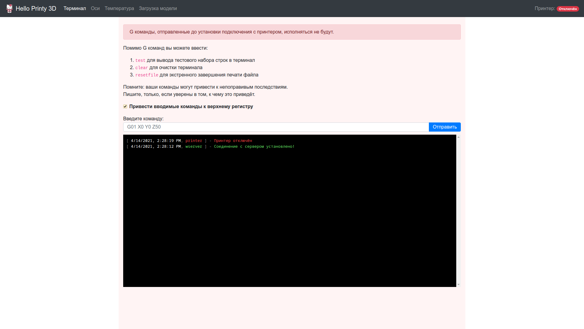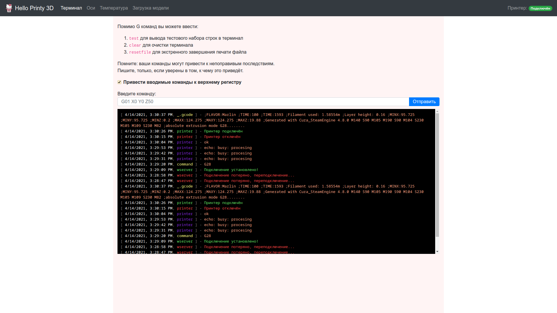 - Терминал. Можно отправлять команды любые G команды ( а это абсолютный контроль над всеми системами принтера ) и видеть все отчёты, которые отправляет принтер в ответ. Также есть возможность очистить терминал и некоторые отладочные функции. Если принтер не подключён или идёт печать, показывается предупреждающее уведомление, что отправка команд будет либо бесполезна, либо опасна.