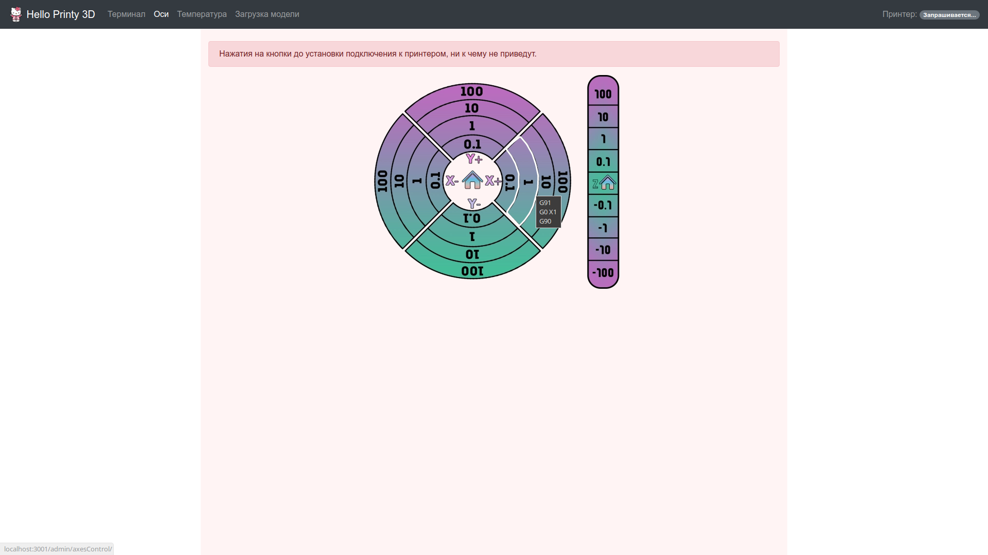 - Контроль осей. Джойстик представляет из себя графическую оболочку над командами для управления положением печатающей головки и стола. Движение по оси происходит относительно текущей позиции. Можно изменять координату на 0.1, 1, 10, 100 единиц. Можно делать в обоих направлениях по каждой оси. Также можно вернуть всё в базовое положение. Функция нужна для тестирования позиционирования печатающих элементов и проверки работы движущих элементов. Также выводятся предупреждения. Во время печати мы не даём человеку выстрелить себе в ногу и все нажатия во время печати модели приведут лишь к всплывающему уведомлению.