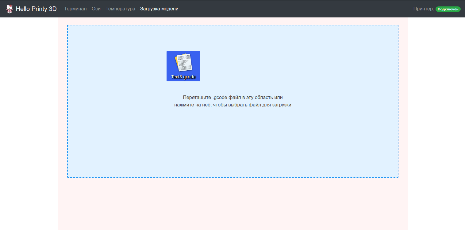 - Загрузка модели. Можно загрузить нарезанную модель. Такое же предупреждение как и на предыдущих страницах. Файл можно как выбрать на файловой системе так и просто перетащить в браузер. Как только начинается печать, вниз показывается статус бар печати, содержащий имя файла, анимированный прогресс бар, процент выполненности, время начала печати и время окончания. Когда печать подойдёт к концу, прогресс бар станет зелёным и появится возможность закрыть статус бар. Прогресс бар можно будет увидеть даже, если закрыть сайт, а потом снова её открыть. В планах добавить функцию финального подтверждения отправки файла, чтобы выбранная модель не отправлялась на печать сразу.