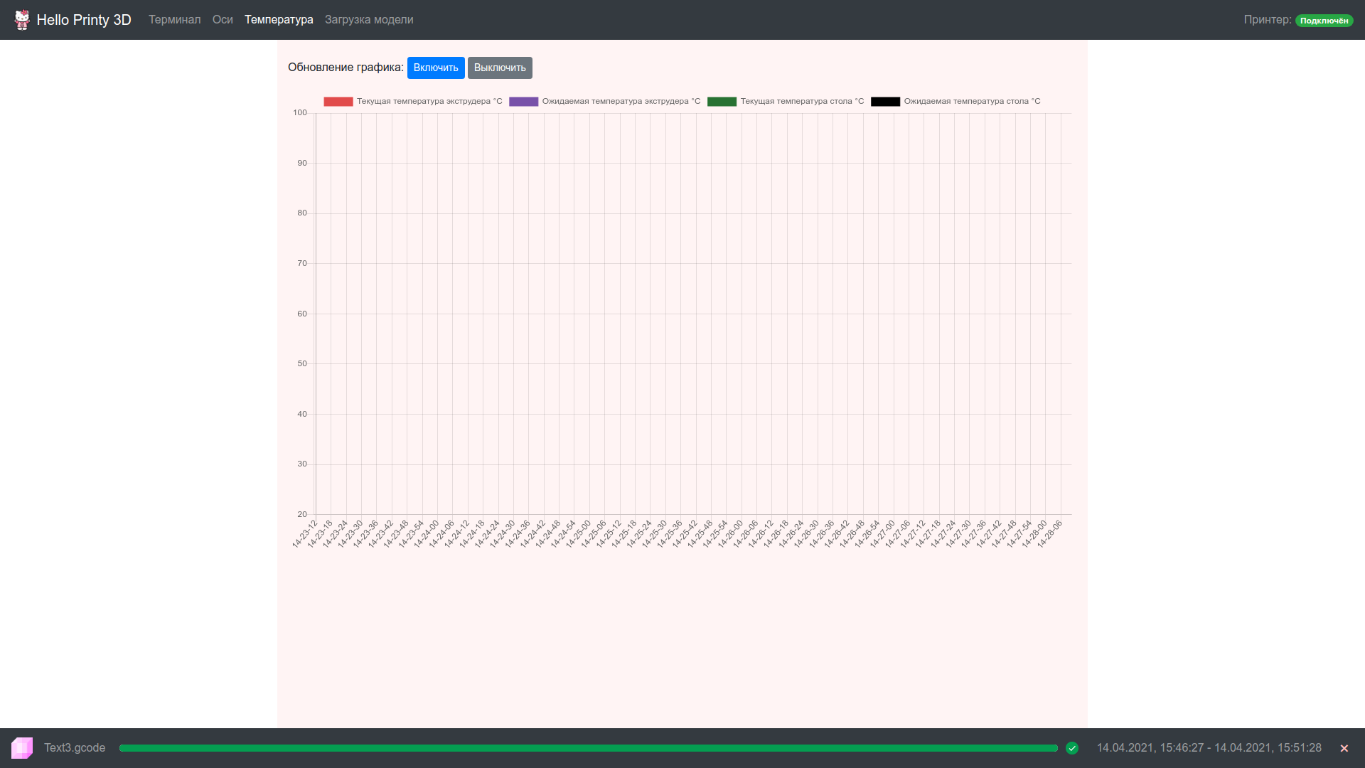 - Температура. На графике показываются реальные температуры и температуры, до которых планируется нагрев, головки и стола за последние 5 минут. Если отсутствует подключение к принтеру, кнопки блокируются.
